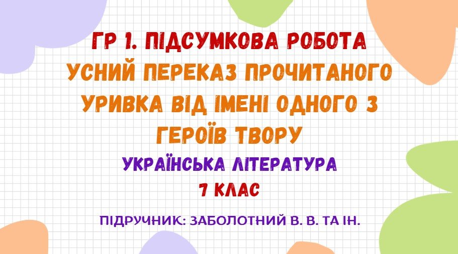 Матеріали «ГР 1. Підсумкова робота. Усний переказ прочитаного уривка від імені одного з героїв твору. Українська література. 7 клас НУШ (Заболотний В. В.)» будуть надіслані в електронному вигляді на вашу поштову скриньку одразу після оплати.