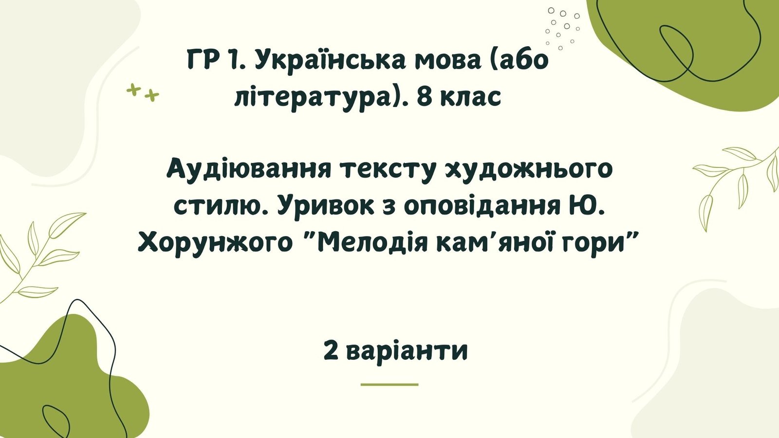 ГР 1. Підсумкова робота. Аудіювання тексту художнього стилю. Уривок з оповідання Юрія Хорунжого “Мелодія кам’яної гори” – 2 варіанти.