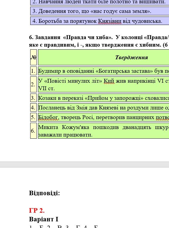 - ГР 2 – завдання за прочитаними творами: тестові завдання, завдання на відповідність, завдання правда чи хиба – 2 варіанти;