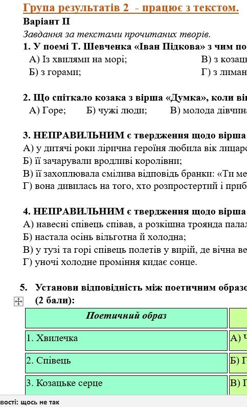 - ГР 2 – тестові завдання, завдання на встановлення відповідностей, завдання “Правда чи хиба” – 2 варіанти;