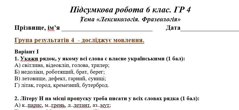ГР 4. Підсумкова (діагностична) робота. 5 клас. Українська мова. “Лексикологія. Групи слів ...