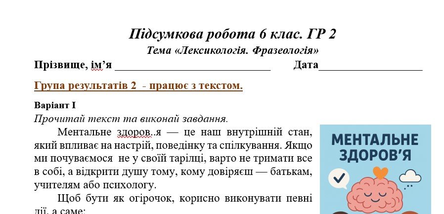 ГР 3. Підсумкова (діагностична) робота. 6 клас. Українська мова “Лексикологія. Фразеологія&...