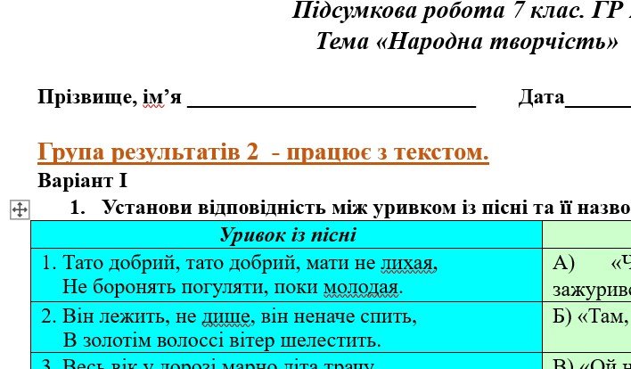 ГР 2. Підсумкова (діагностична) робота. 7 клас. Українська література “Народна творчість” (МНП Заболотного) 2 варіанти