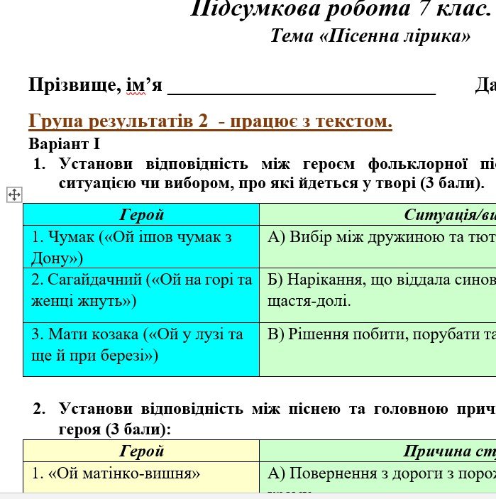 Щоб купити «ГР 2. Підсумкова (діагностична) робота. 7 клас. Українська література “Пісенна лірика” (МНП Яценко, підручник Авраменка) 2 варіанти», потрібно додати матеріал до кошика та оплатити замовлення.