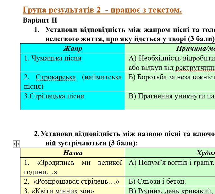 Щоб купити «ГР 2. Підсумкова (діагностична) робота. 7 клас. Українська література “Пісенна лірика” (МНП Яценко, підручники Яценко, Калинич) 2 варіанти», потрібно додати матеріал до кошика та оплатити замовлення.