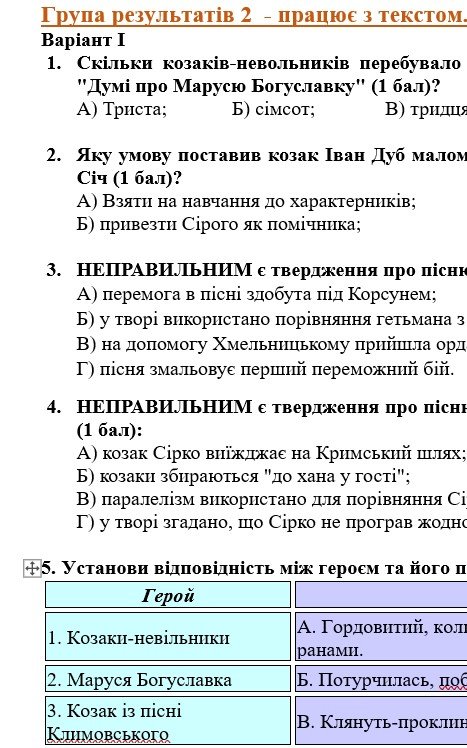 ГР 2 Підсумкова (діагностична) робота з української літератури для 8 класу НУШ “Література козацької України”. МНП Яценко, підручник Яценко