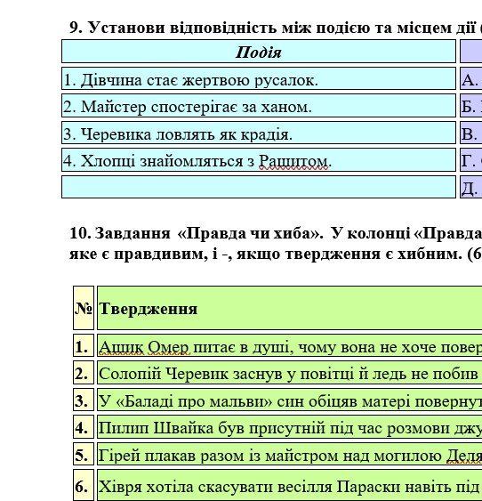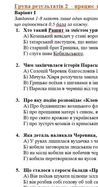- ГР 2 – тестові завдання, завдання на встановлення відповідності, завдання “Правда чи хиба” – 2 варіанти;