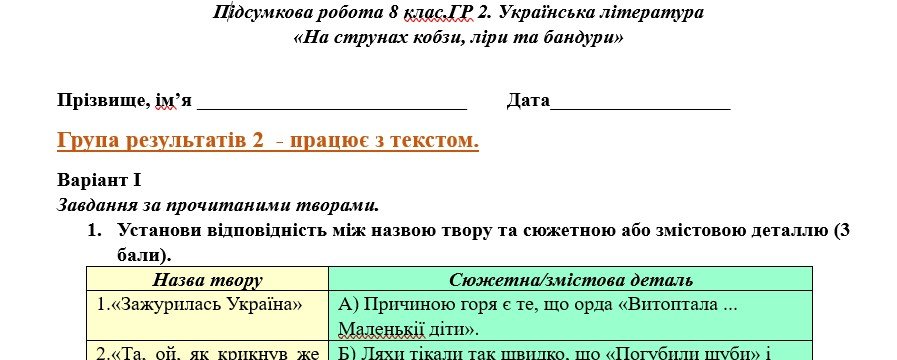 ГР 2. Підсумкова (діагностична) робота. 8 клас. Українська література. “На струнах кобзи, ліри та бандури” (МНП Заболотного)