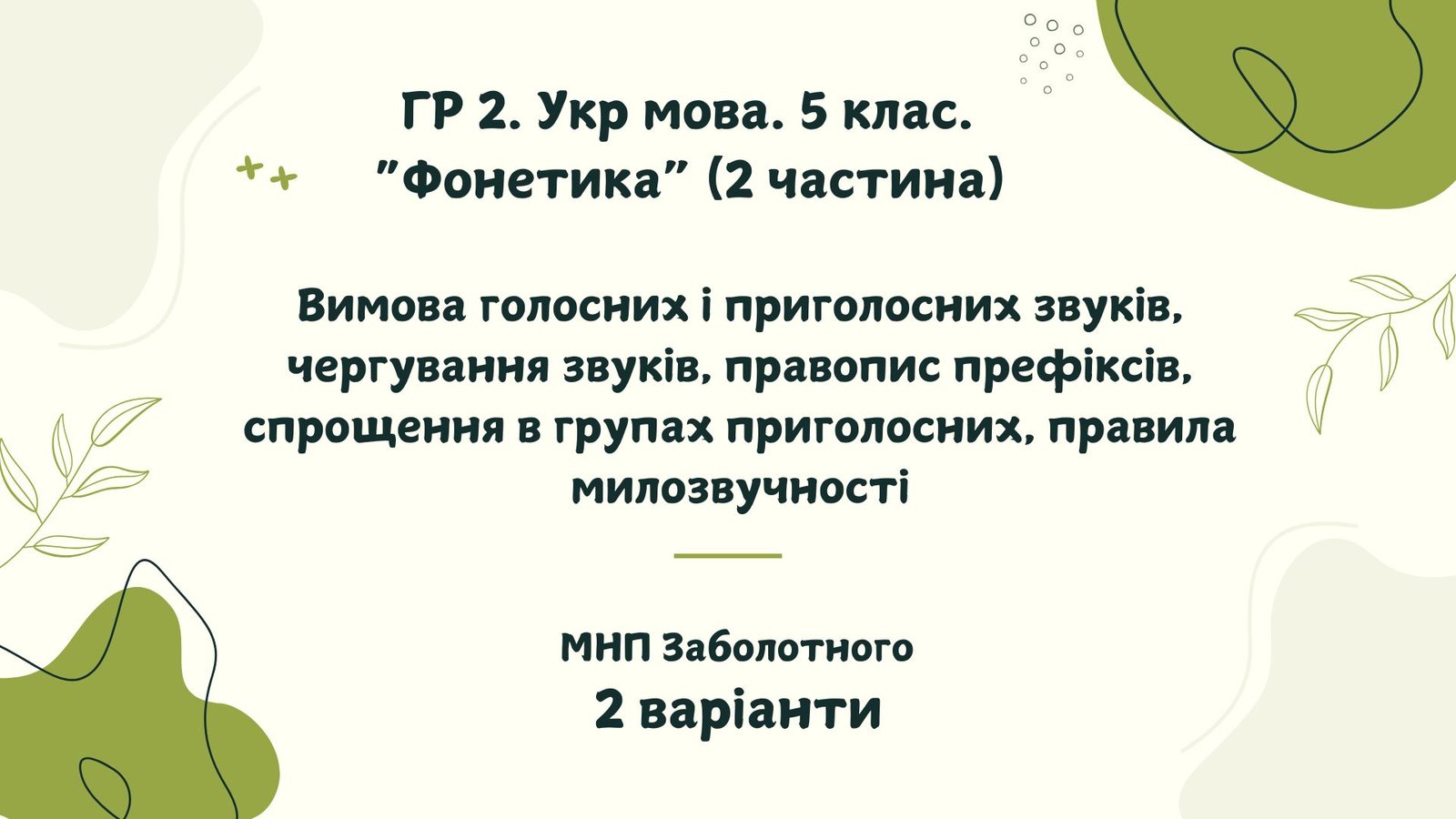 ГР 2. Підсумкова (діагностична) робота. Укр. мова. 5 клас “Фонетика. Графіка. Орфоепія. Орфографія” ІІ частина; МНП Заболотного 2 варіанти