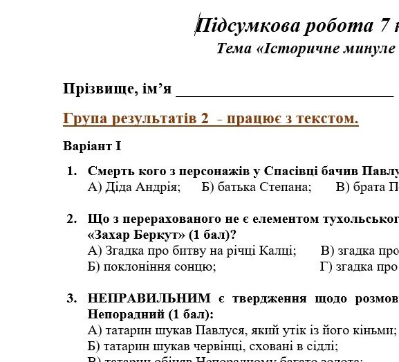 ГР 2. Підсумкова (діагностична) робота. Українська література. 7 клас. “Історичне минуле України” МНП Яценко, підручники Яценко, Калинич; 2 варіанти