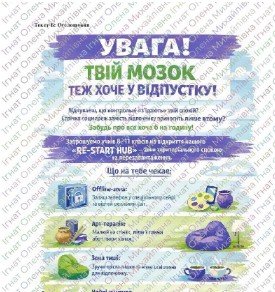 - І варіант – текст А “Ти не робот, і це нормально” (про якісний відпочинок та перезавантаження); текст Б – оголошення “Твій мозок теж хоче у відпусту”;