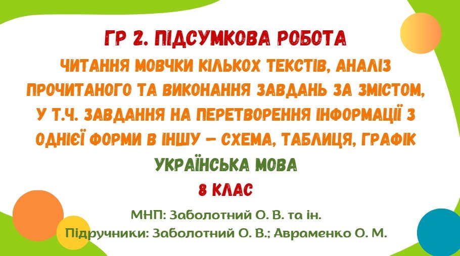 Коли я отримаю матеріал «ГР 2. Підсумкова робота. Читання мовчки кількох текстів, аналіз прочитаного та виконання завдань за змістом. Українська мова. 8 клас (Заболотний О.)»?