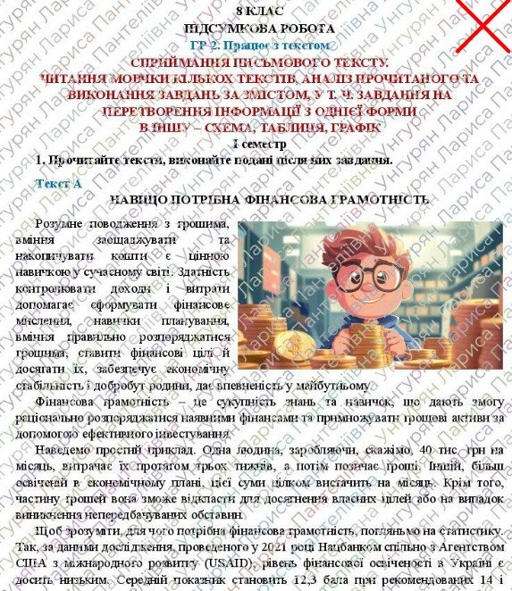 Завдання для підсумкової роботи з української мови за ГР 2 “Працює з текстом” розроблено для учнів 8 класу. Для проведення читання мовчки дібрано 2 тексти публіцистичного стилю, які сприяють формуванню ключової компетентності “Підприємливість і фінансова грамотність”.