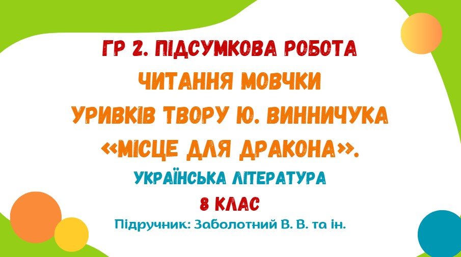 Коли я отримаю матеріал «ГР 2. Підсумкова робота. Читання мовчки уривків твору Ю. Винничука «Місце для дракона». Українська література. 8 клас НУШ (Заболотний В. В.)»?