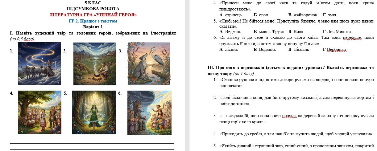 Підсумкова робота відповідає підручнику “Українська література. 5 клас” (автор: Авраменко О. М.). Може використовуватися для формувального, поточного чи підсумкового оцінювання.