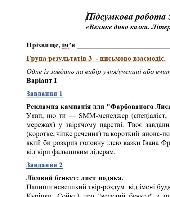 ГР 3. Підсумкова (діагностична) робота. 5 клас. Українська література “Велике диво казки. Літературні казки” (МНП Архипової) 2 варіанти