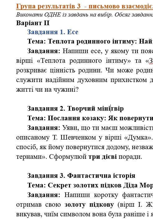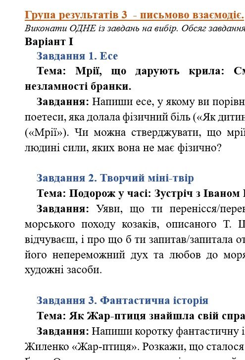 - ГР 3 – ТРИ завдання на вибір учня/учениці (або вчителя/ьки) – написання цікавих і креативних творчих робіт, пов’язаних з прочитаними творами – 2 варіанти;