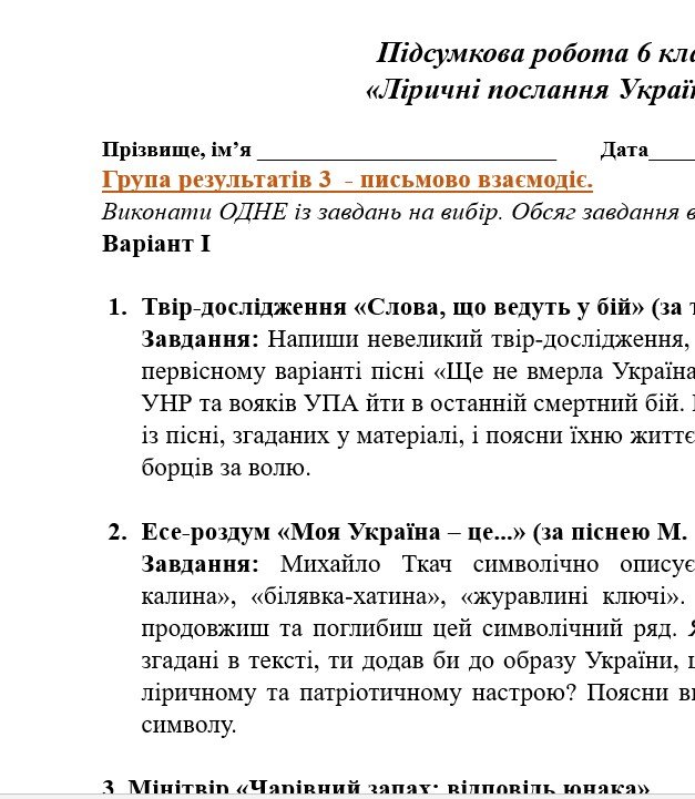 Коли я отримаю матеріал «ГР 3. Підсумкова (діагностична) робота. 6 клас. Українська література. “Ліричні послання Україні”; (МНП Яценко) 2 варіанти»?