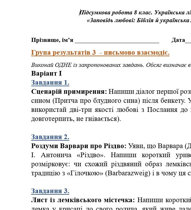 Щоб купити «ГР 3. Підсумкова (діагностична) робота 8 кл. Українська літ. “Заповідь любові: Біблія та укр.літ.”(МНП Яценко) Підручник Калинич 2 варіанти», потрібно додати матеріал до кошика та оплатити замовлення.