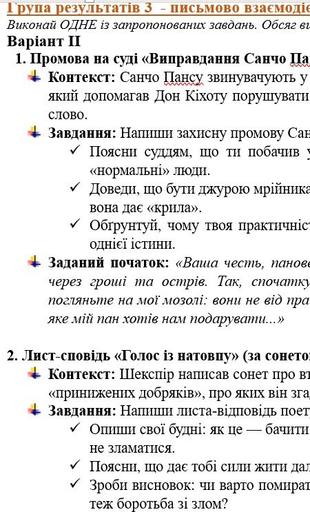 - ГР 3 – ТРИ завдання на вибір учня/учениці (або вчителя/ьки) (написання креативних творчих робіт за тематикою розділу) – 2 варіанти;;