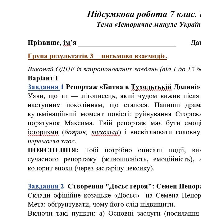 ГР 3. Підсумкова (діагностична) робота. Українська література. 7 клас. “Історичне минуле України” МНП Яценко, підручник Авраменка; 2 варіанти