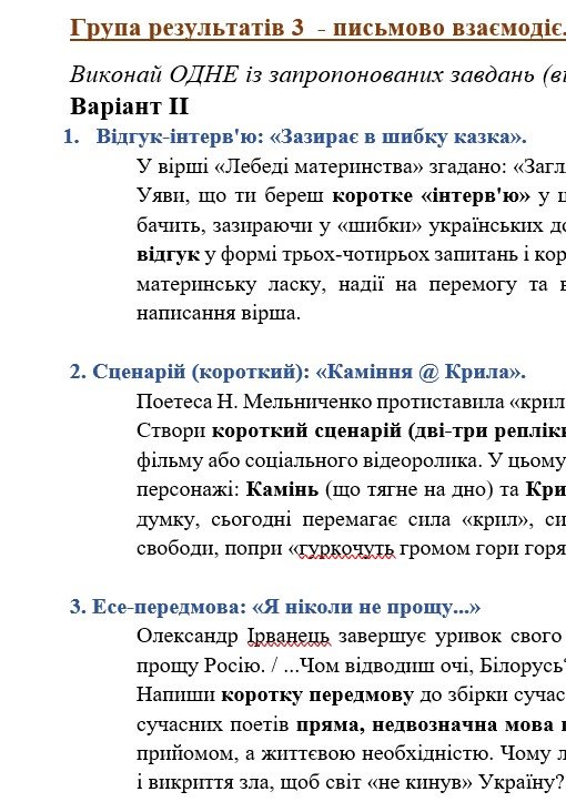 - ГР 3 – три завдання на вибір учня/учениці (або вчителя/ки) (написання цікавих і креативних творчих робіт) – 2 варіанти;