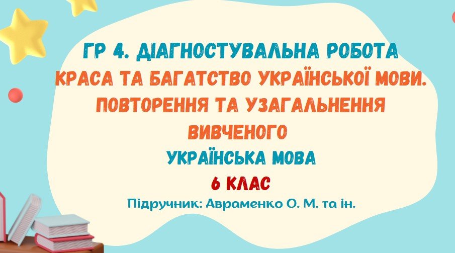 Діагностувальна робота відповідає підручнику “Українська мова. 6 клас” (автори: Авраменко О. М. та ін.). Може використовуватися для формувального, поточного чи підсумкового оцінювання.