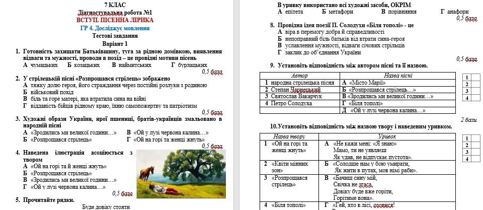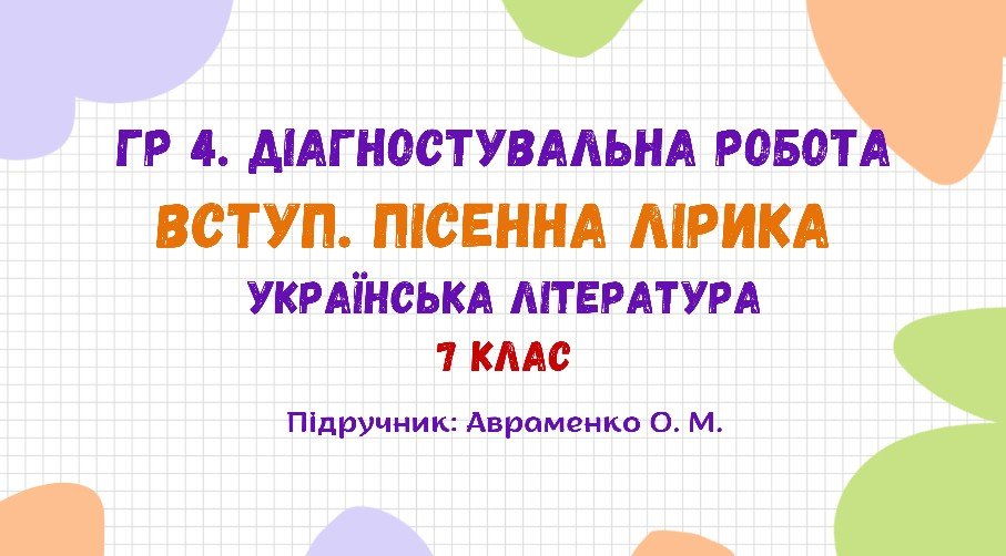 Як купити матеріал «ГР 4. Діагностувальна робота №1. Вступ. Пісенна лірика. Українська література. 7 клас НУШ (підручник: Авраменко О. М.)»?