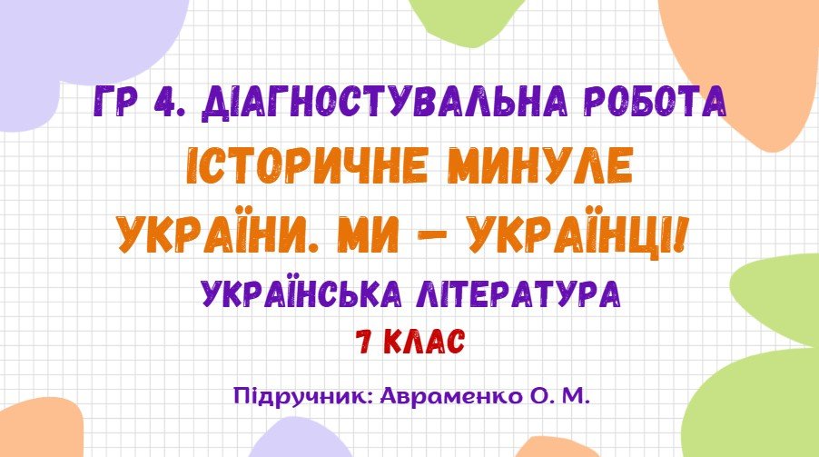 Матеріали «ГР 4. Діагностувальна робота №2. Історичне минуле України. Ми – українці! Українська література. 7 клас НУШ (підручник: Авраменко О. М.)» будуть надіслані в електронному вигляді на вашу поштову скриньку одразу після оплати.