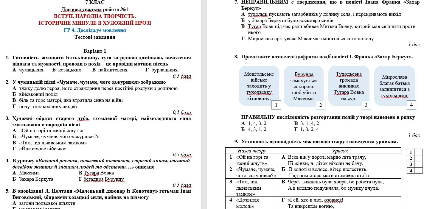 Діагностувальна робота відповідає підручнику “Українська література. 7 клас” (автор: Авраменко О. М.). Може використовуватися для формувального, поточного чи підсумкового оцінювання.
