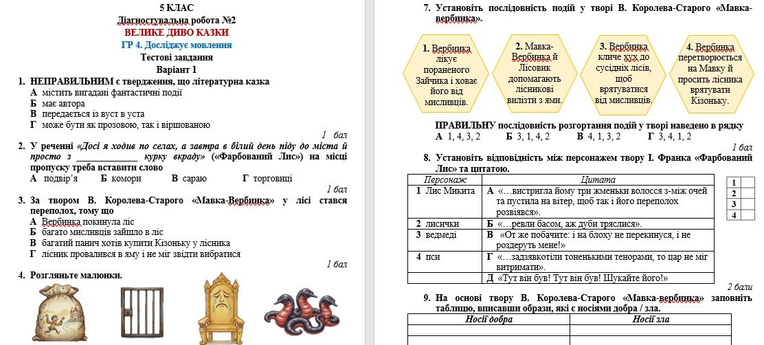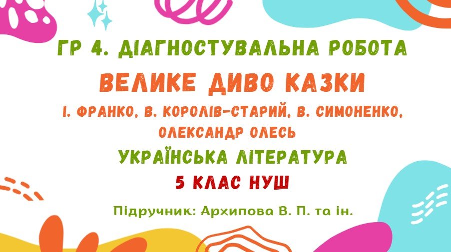 Діагностувальна робота з української літератури за ГР 4 “Досліджує мовлення” розроблена для учнів 5 класу, які вивчили тему “ВЕЛИКЕ ДИВО КАЗКИ. І. Франко, В. Королів-Старий, В. Симоненко, Олександр Олесь” (модельна навчальна програма «Українська література. 5-6 класи» для закладів загальної середньої освіти (автори: Архипова В. П., Січкар С. І., Шило С. Б.)).