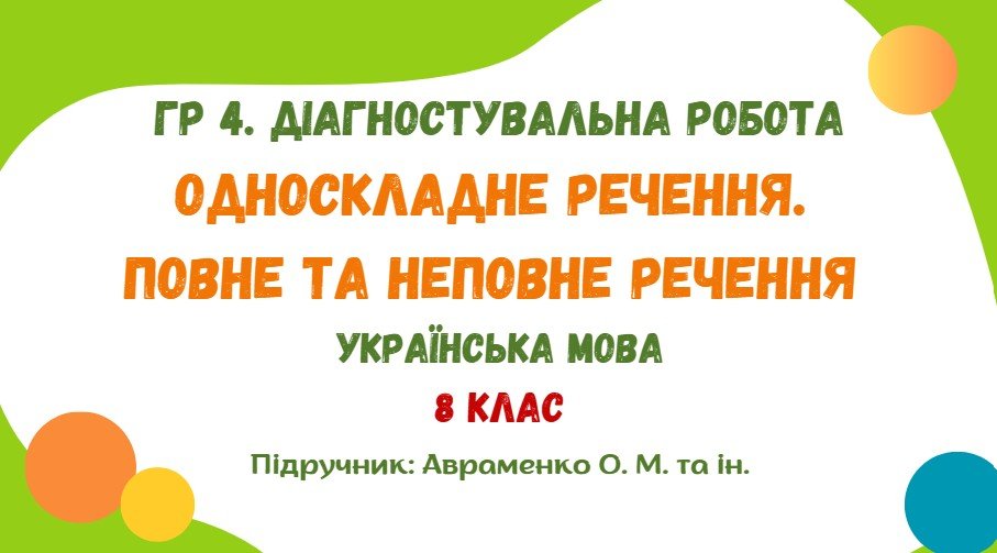 Коли я отримаю матеріал «ГР 4. Діагностувальна робота №4. Односкладне речення. Повне та неповне речення. Українська мова. 8 клас НУШ (підручник: Авраменко О. М. та ін.)»?