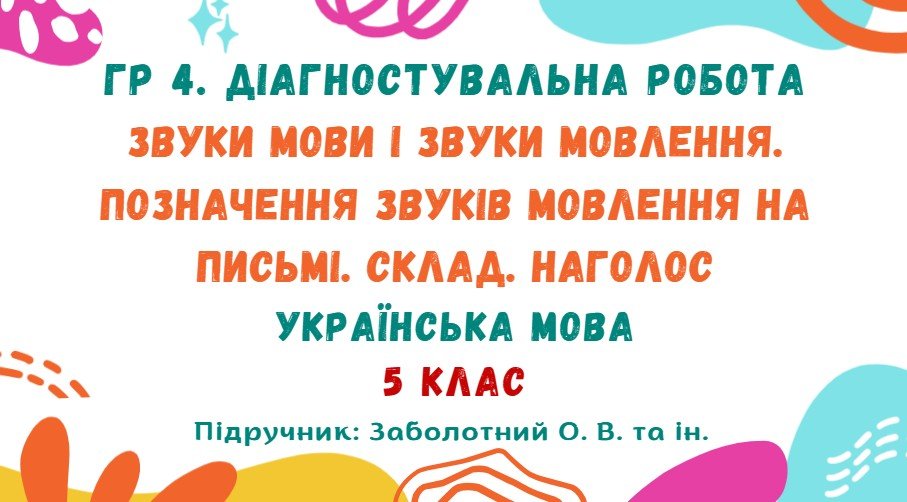 Діагностувальна робота з української мови за ГР 4 “Досліджує мовлення” розроблена для учнів 5 класу, які вивчили тему “Звуки мови і звуки мовлення. Позначення звуків мовлення на письмі. Склад. Наголос” (модельна навчальна програма «Українська мова. 5-6 класи» для закладів загальної середньої освіти (автори: Заболотний О.В., Заболотний В.В., Лавринчук В.П., Плівачук К.В., Попова Т.Д.)).