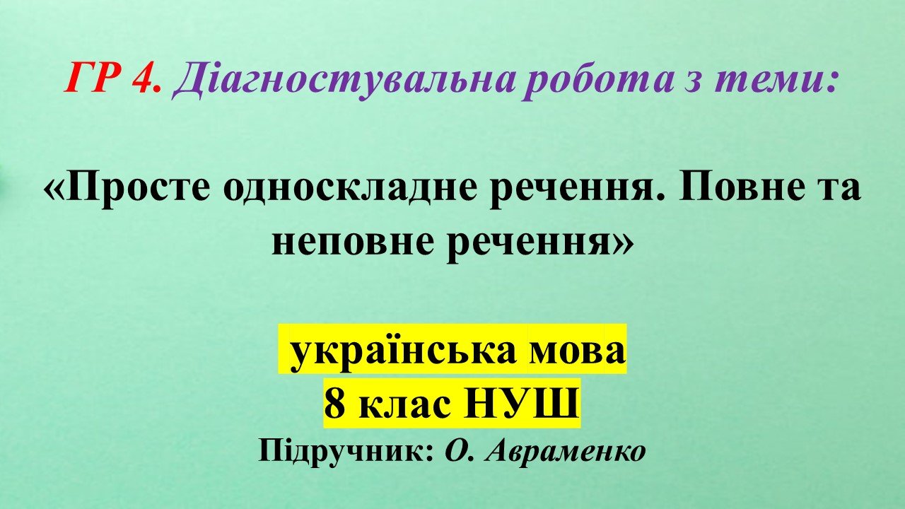 ГР 4. Діагностувальна робота. Просте односкладне речення. Повне та неповне речення 8 клас НУШ.