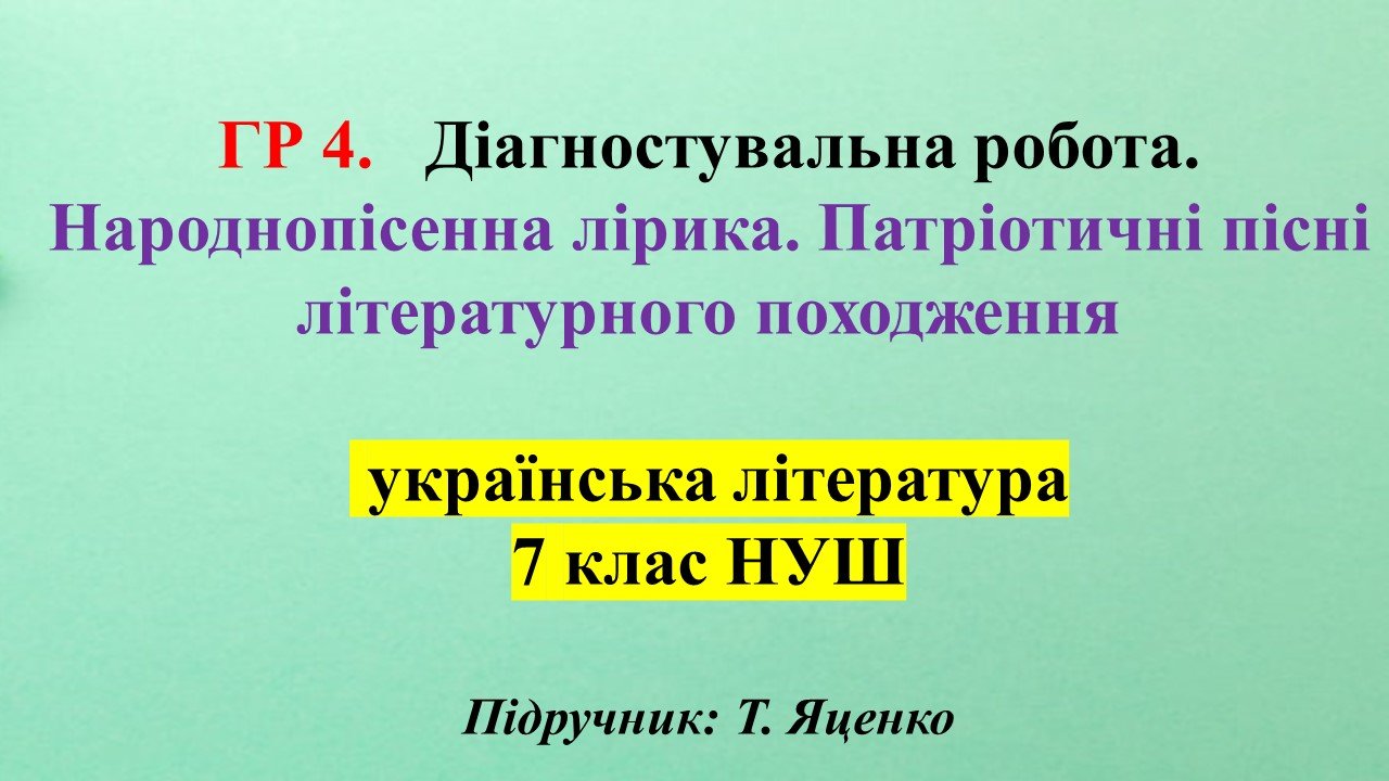 Комплексна підсумкова робота. 7 клас. Українська література. “Пісенна лірика” за чоти...