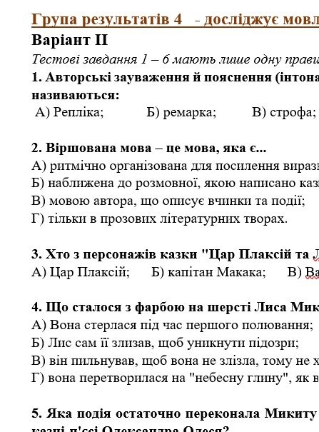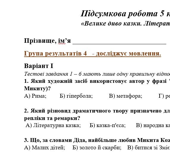 ГР 4. Підсумкова (діагностична) робота. 5 клас. Українська література “Велике диво казки. Літературні казки” (МНП Архипової) 2 варіанти