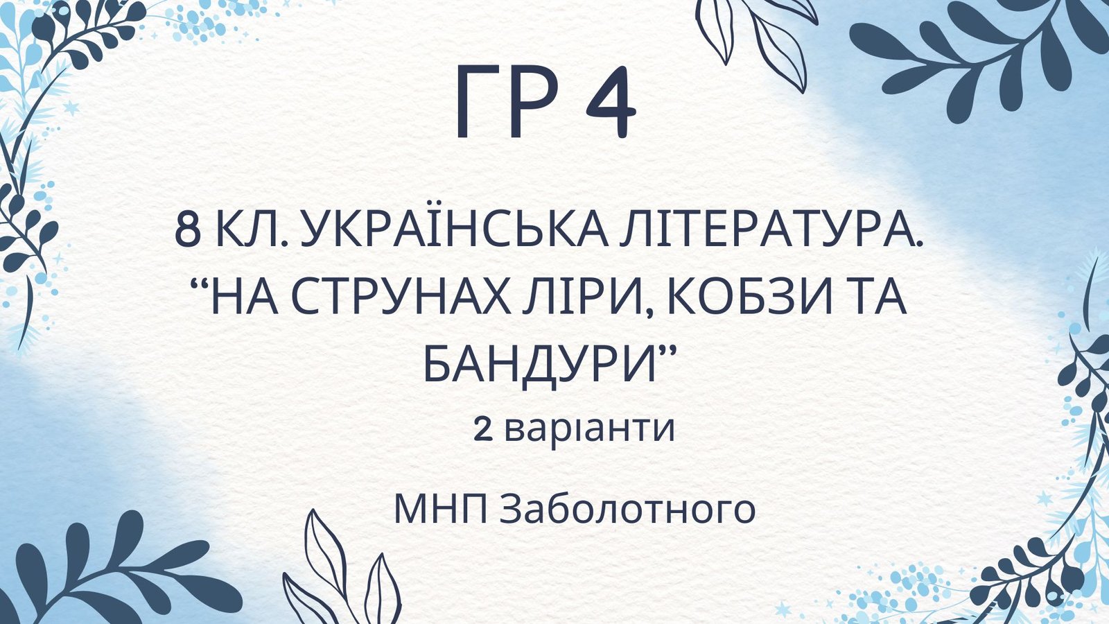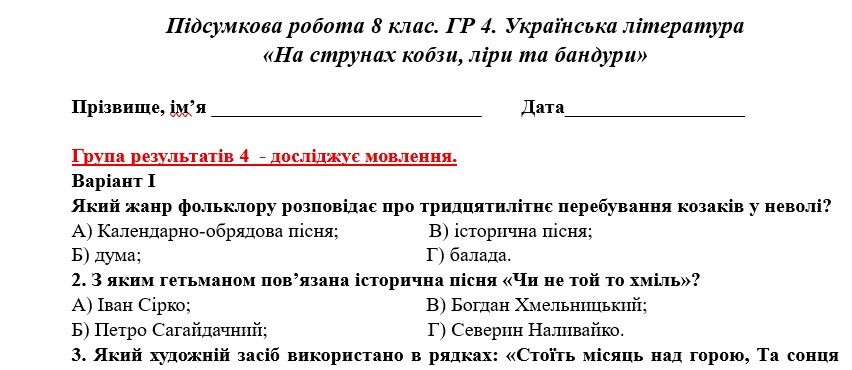 ГР 4. Підсумкова (діагностична) робота. 8 клас. Українська література. “На струнах кобзи, ліри та бандури” (МНП Заболотного)