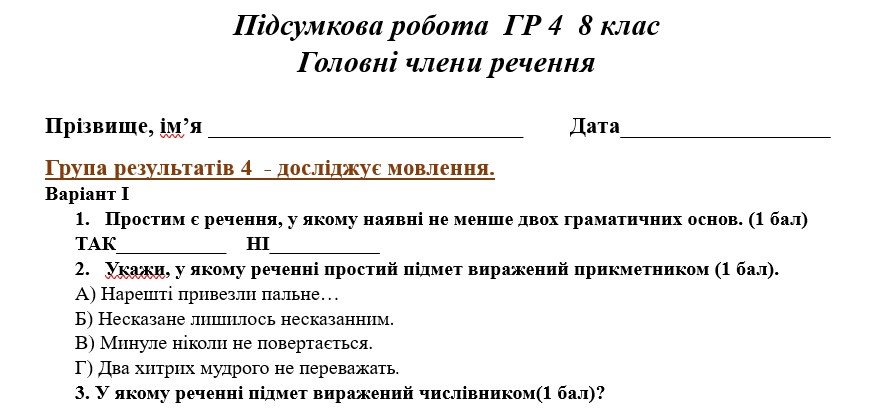 ГР 3. Підсумкова (діагностична) робота 8 клас. Українська мова “Головні члени речення”...