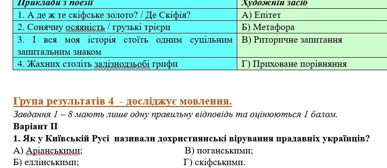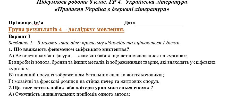 ГР 4. Підсумкова (діагностична) робота. Українська література “Прадавня література в дзеркалі літератури” (МНП Яценко, підручник Калинич)