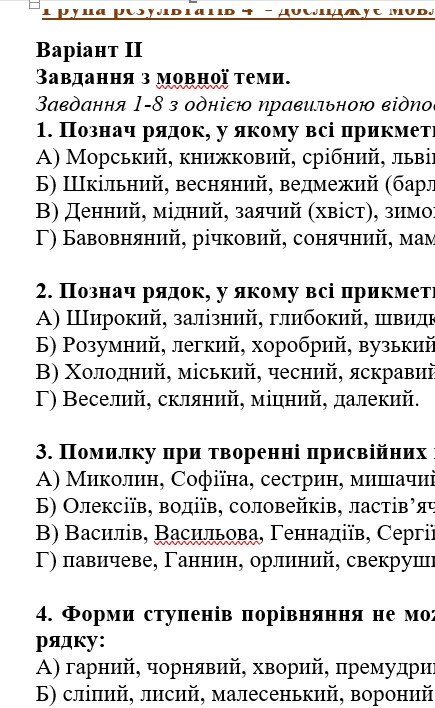 - ГР 4 – тестові завдання, завдання на встановлення відповідностей, робота зі словом (морфологічний розбір) – 2 варіанти.