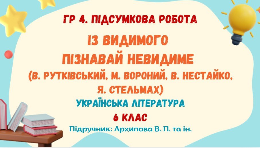 Підсумкова робота з української літератури за ГР 4 “Досліджує мовлення” розроблена для учнів 6 класу, які вивчили тему “ІЗ ВИДИМОГО ПІЗНАВАЙ НЕВИДИМЕ. В. Рутківський, М. Вороний, В. Нестайко, Я. Стельмах” (модельна навчальна програма «Українська література. 5-6 класи» для закладів загальної середньої освіти (автори: Архипова В. П., Січкар С. І., Шило С. Б.)).