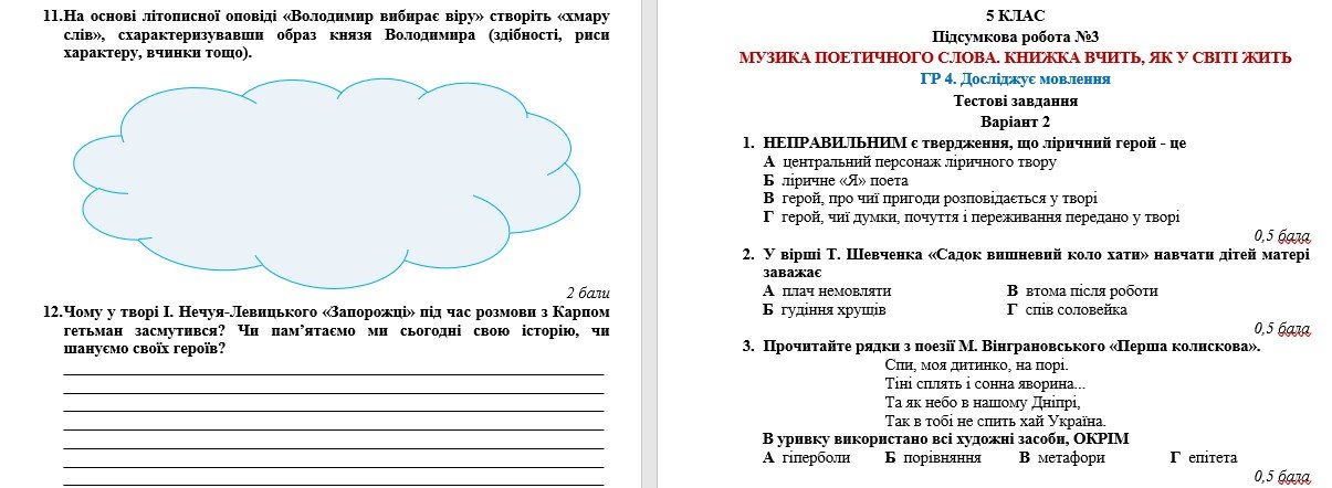 Підсумкова робота з української літератури за ГР 4 “Досліджує мовлення” розроблена для учнів 5 класу, які вивчили тему “МУЗИКА ПОЕТИЧНОГО СЛОВА. КНИЖКА ВЧИТЬ, ЯК У СВІТІ ЖИТЬ. Т. Шевченко, П. Тичина, Є. Гуцало, М. Рильський, М. Вінграновський, літописні оповіді, Олександр Олесь, І. Нечуй-Левицький” (модельна навчальна програма «Українська література. 5-6 класи» для закладів загальної середньої освіти (автори: Архипова В. П., Січкар С. І., Шило С. Б.)).