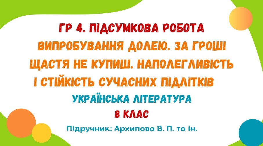 Підсумкова робота з української літератури за ГР 4 “Досліджує мовлення” розроблена для учнів 8 класу, які вивчили тему “ВИПРОБУВАННЯ ДОЛЕЮ. ЗА ГРОШІ ЩАСТЯ НЕ КУПИШ. НАПОЛЕГЛИВІСТЬ І СТІЙКІСТЬ СУЧАСНИХ ПІДЛІТКІВ. М. Коцюбинський, І. Карпенко-Карий, О. Радушинська, А. Шевердіна“ (модельна навчальна програма «Українська література. 7–9 класи» для закладів загальної середньої освіти (автори: Заболотний О. В., Слоньовська О. В., Ярмульська І. В.)).