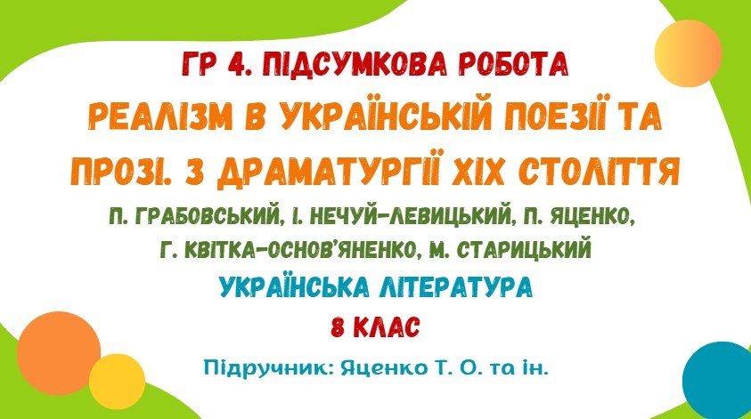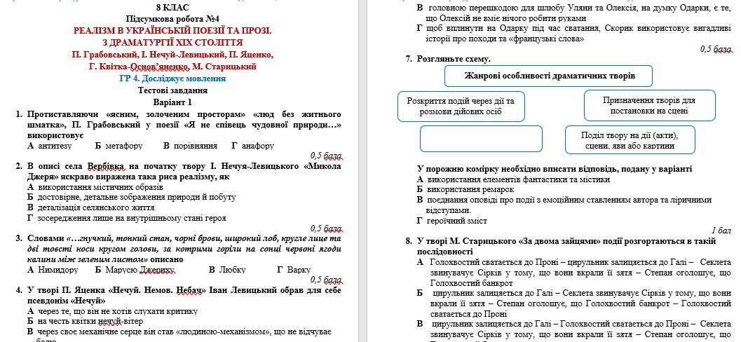 Підсумкова робота з української літератури за ГР 4 “Досліджує мовлення” розроблена для учнів 8 класу, які вивчили тему “РЕАЛІЗМ В УКРАЇНСЬКІЙ ПОЕЗІЇ ТА ПРОЗІ. З ДРАМАТУРГІЇ ХІХ СТОЛІТТЯ П. Грабовський, І. Нечуй-Левицький, П. Яценко, Г. Квітка-Основ’яненко, М. Старицький” (модельна навчальна програма «Українська література. 7–9 класи» для закладів загальної середньої освіти (автори: Яценко Т. О., Пахаренко В. І., Слижук О. А., Тригуб І. А.)).
