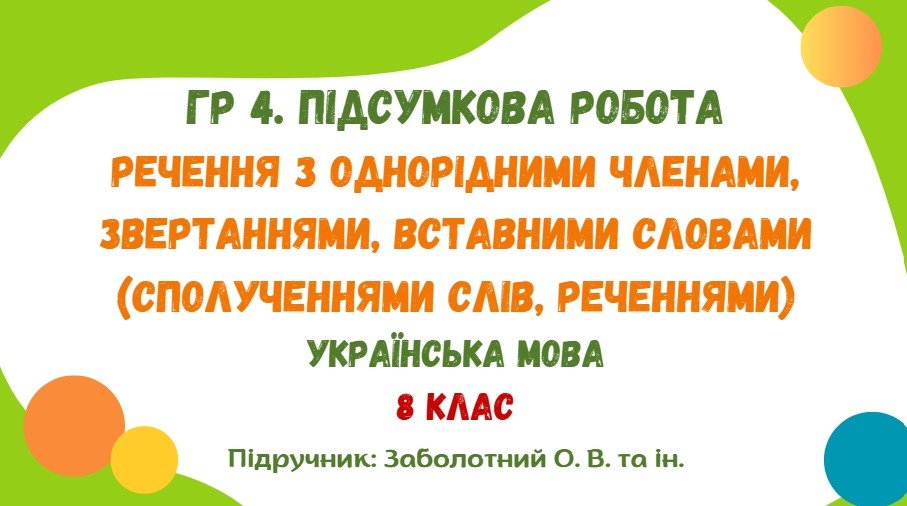 Як купити матеріал «ГР 4. Підсумкова робота №5. Речення з однорідними членами, звертаннями, вставними словами. Українська мова. 8 клас НУШ (підручник: Заболотний О. В.)»?