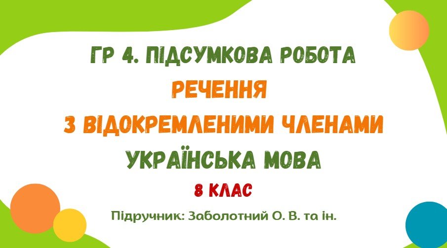 Підсумкова робота з української мови за ГР 4 “Досліджує мовлення” розроблена для учнів 8 класу, які вивчили тему “Речення з відокремленими членами” (модельна навчальна програма «Українська мова. 7–9 класи» для закладів загальної середньої освіти (автори: Заболотний О. В., Заболотний В. В., Лавринчук В. П., Плівачук К. В., Попова Т. Д.)).