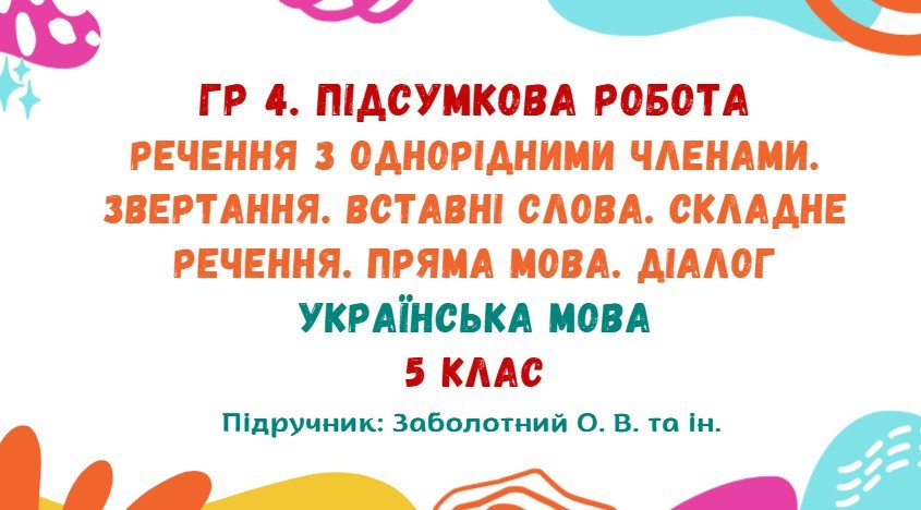 Коли я отримаю матеріал «ГР 4. Підсумкова робота №8. Речення з однорідними членами. Звертання. Вставні слова. Складне речення. Пряма мова. Діалог. 5 клас (Заболотний О. В.)»?