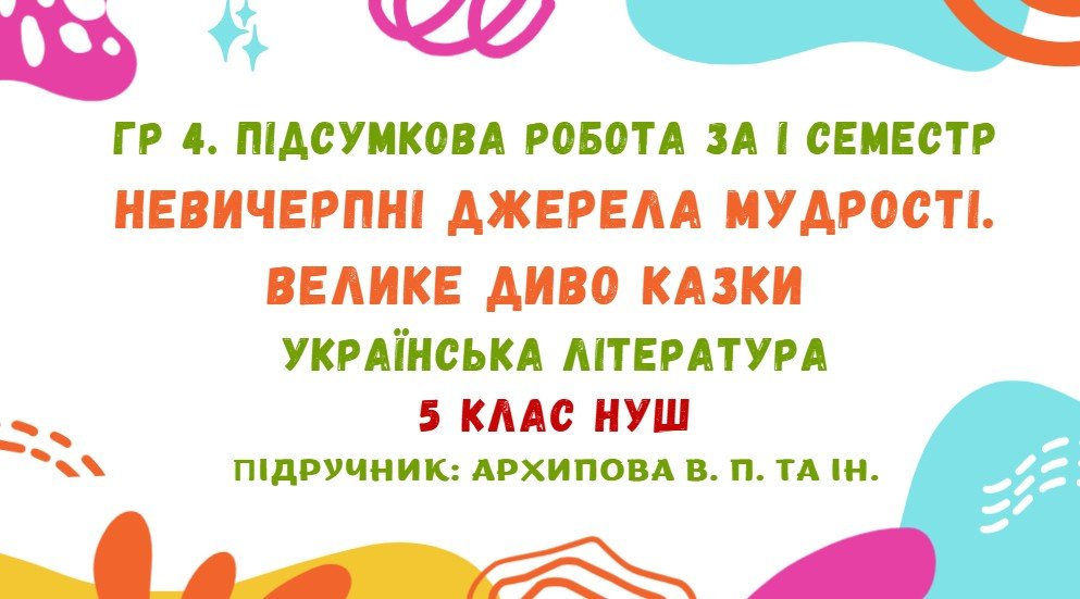 ГР 4. Підсумкова робота за І семестр. Невичерпні джерела мудрості. Велике диво казки. Українська література. 5 клас НУШ (підручник: Архипова В. П.)