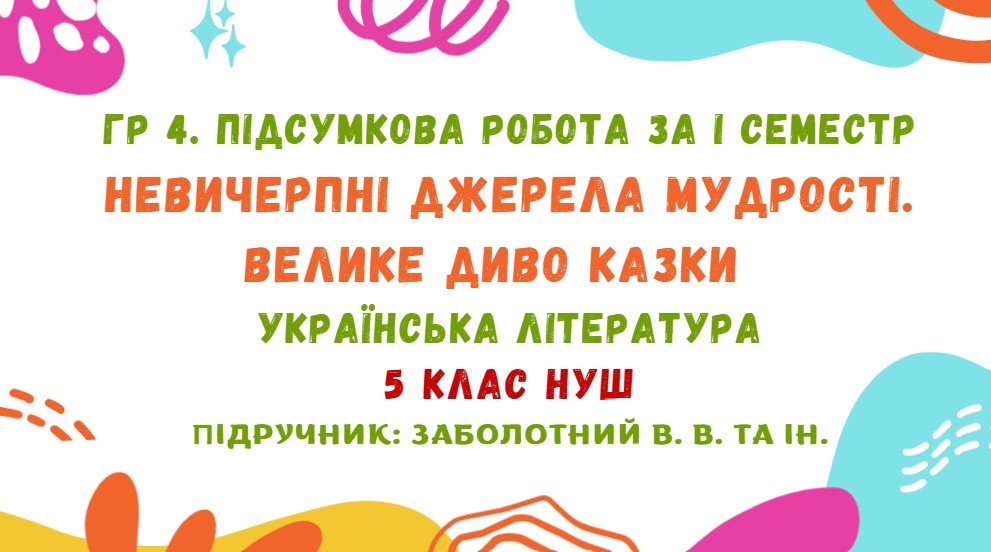 ГР 4. Підсумкова робота за І семестр. Невичерпні джерела мудрості. Велике диво казки. Українська література. 5 клас НУШ (підручник: Заболотний В. В.)