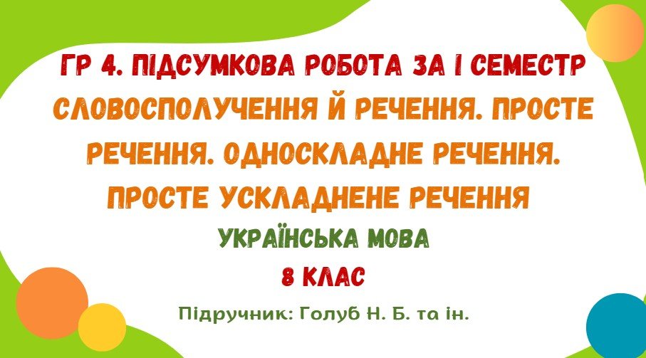 Коли я отримаю матеріал «ГР 4. Підсумкова робота за І семестр. Словосполучення й речення. Просте речення. Односкладне речення. Просте ускладнене речення. 8 клас (Голуб Н. Б.)»?